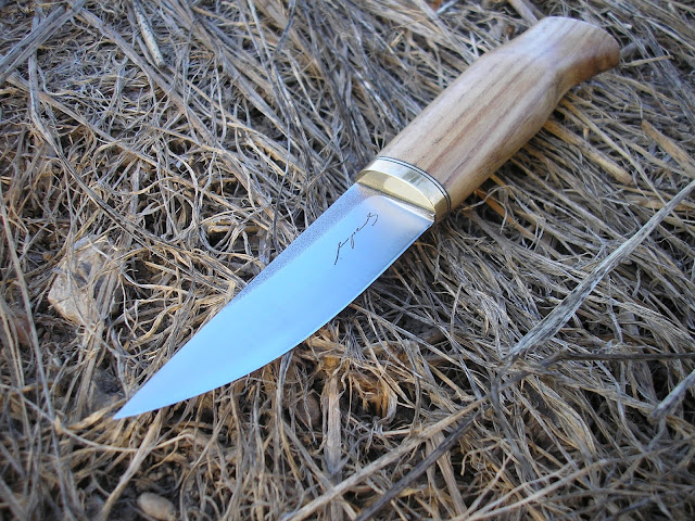 The next tiny, but aggressive member of the minions tribe with the code name #17. The blade is the same like his brother's #16, but with higher grinded bevels. The handle is ash tree, impregnated and sealed with carnauba wax. Brass guard. OAL - 165mm, blade - 75/20/3,8mm.